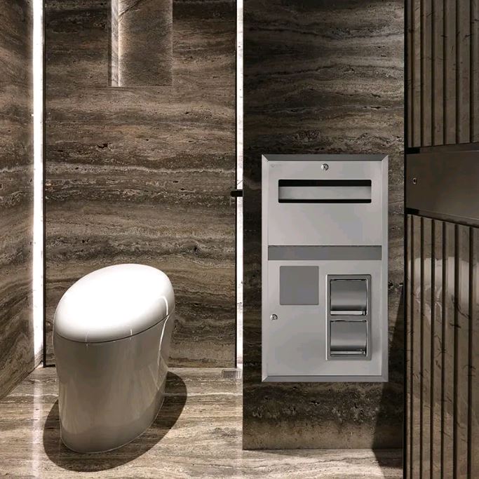 Настенный встраиваемый в стену блок. Состоит из: Диспенсера покрытий на унитаз 1/2 сложения, Держатели туалетной бумаги в бытовых рулонах 2 шт, Урна для мусора компактная 4 л